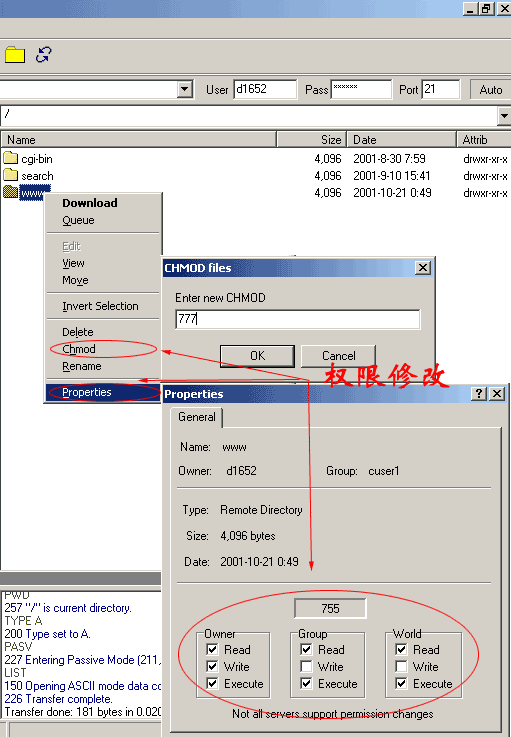 2、在属性中可以看到文件夹的权限设置。在Read前面打勾,表示可读,在Write前面打勾,表示可写,在Execcute前面打勾。表示可执行。可以在前面打勾来更改权限。也可以点击chmod,直接输入数字更改权限。